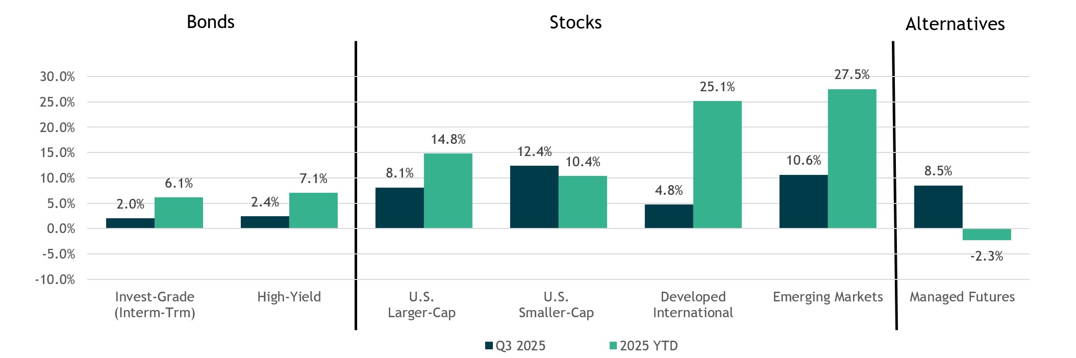 Performance reflects index returns as follows (left to right): Bloomberg US Aggregate, ICE BofA US High Yield, S&P 500, Russell 2000, MSCI EAFE, MSCI EM, SG Trend Index. Source: Morningstar Direct. Data as of 9/30.2025.