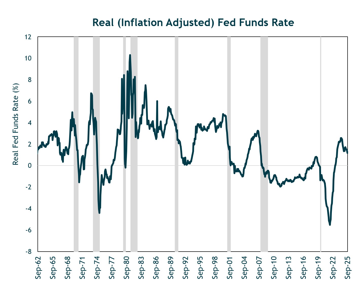 - One metric we use to assess how accommodative or restrictive Fed policy is, is the real (inflation-adjusted) fed funds rate. Today, the real fed funds rate stands at roughly 1.2%.