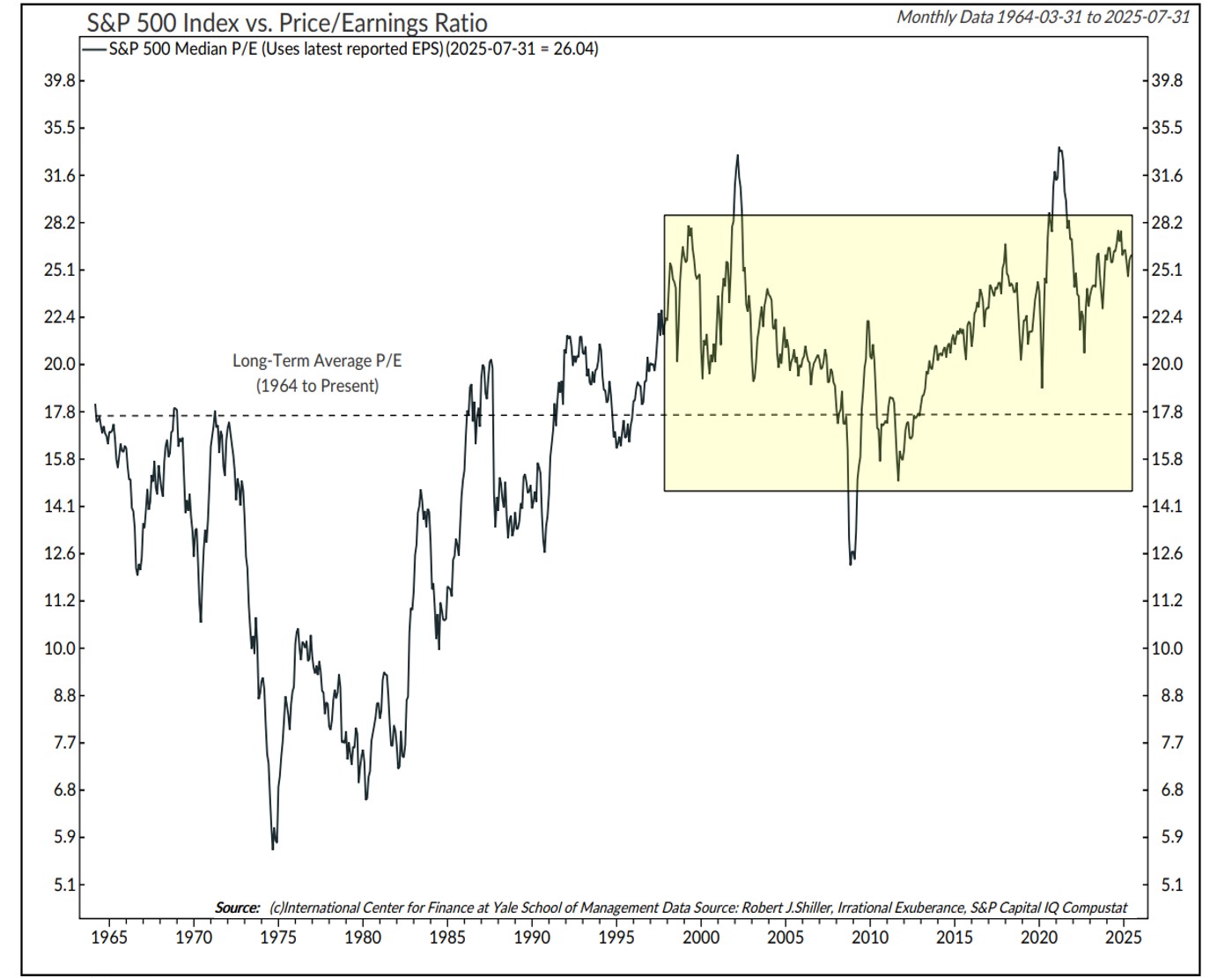 - At present, the S&P 500 trades at roughly 26x trailing 12-month earnings compared to a long-term average of 17.8x.