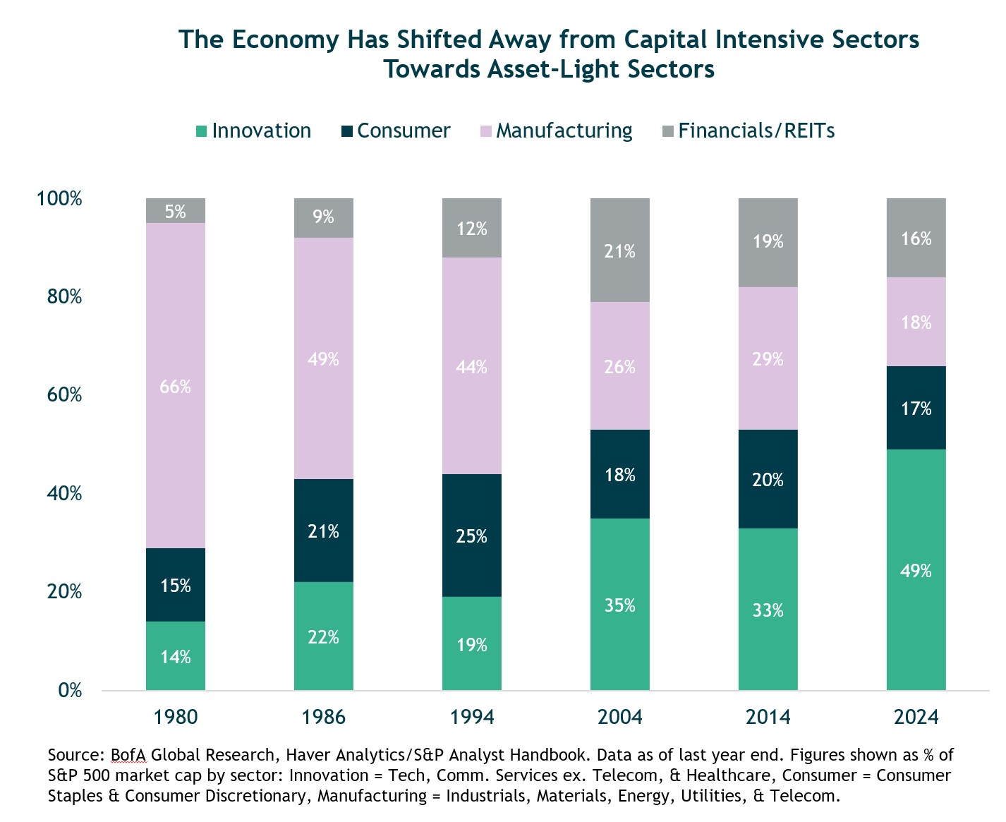 - Today’s economy looks very different than past decades. Historically, capital-intensive industries with lower margins and higher reinvestment needs dominated the market.