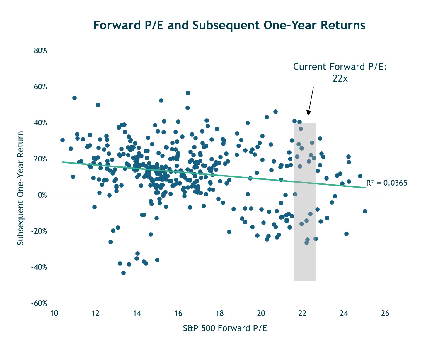 - Today, valuations are at about 22x forward earnings, which is high relative to history. When we look at past periods (shown in the gray shaded bar in the chart below), subsequent 12-month returns following similar valuation levels have been extremely wide, ranging from significant losses to strong gains.
