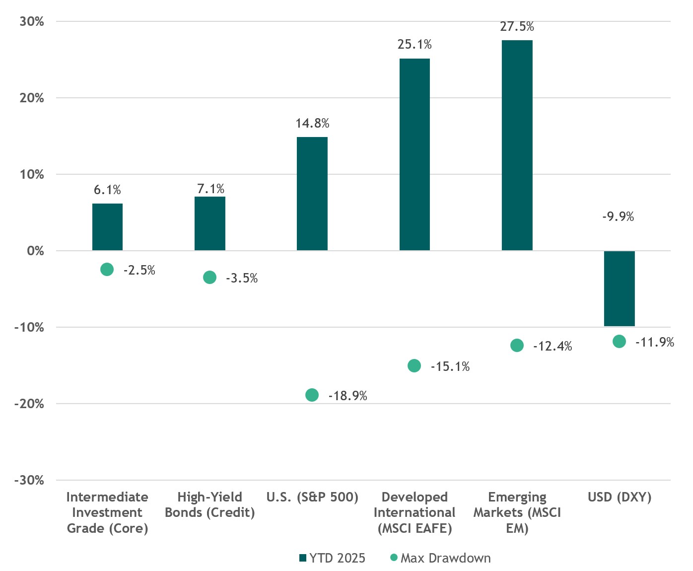 Maximum drawdown for equities calculated using price return and reflects largest peak to trough drawdown during the year. Source: Bloomberg, FactSet. As of 6/30/2025. Performance reflects index returns as follows (left to right): Bloomberg US Aggregate, ICE BofA US High Yield, S&P 500, Russell 2000, MSCI EAFE, MSCI EM, SG Trend Index. Source: Morningstar Direct. Data as of 9/30.2025.
