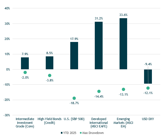 Maximum drawdown for equities calculated using price return and reflects largest peak to trough drawdown during the year. Source: Bloomberg, FactSet. As of 12/31/2025. Performance reflects index returns as follows (left to right): Bloomberg US Aggregate, ICE BofA US High Yield, S&P 500, Russell 2000, MSCI EAFE, MSCI EM, SG Trend Index. Source: Morningstar Direct. Data as of 12/31/2025.