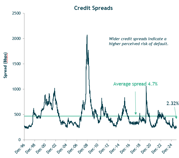 - Credit markets remain strong, with investment grade and high-yield spreads tightening further, underscoring strong corporate fundamentals and demand for yield.