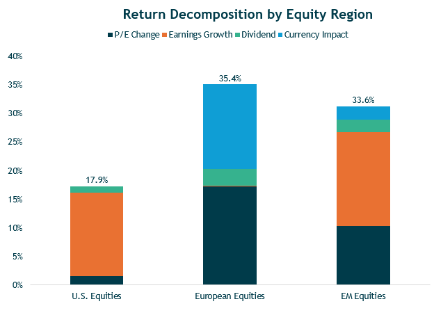 - European equities saw their 2025 return mostly driven by a falling U.S. dollar and improved sentiment (i.e., higher P/E multiple).