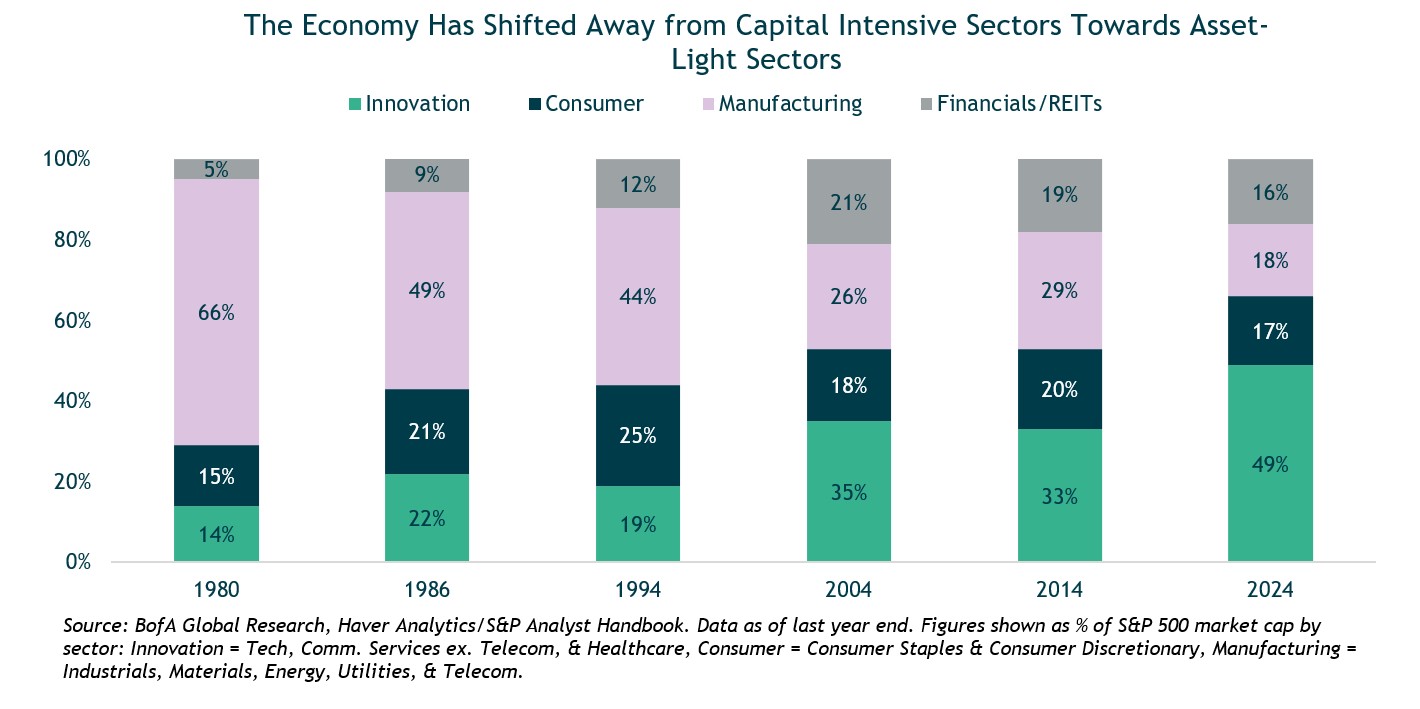 Valuations are also a concern of ours, as U.S. stocks reached new all-time highs in September. Naturally, current price levels raise the question of valuation – are stocks too expensive and should we take risk off the table? Today, the U.S. stock market trades at roughly 26x trailing 12-month earnings compared to a long-term average of 17.8x. These elevated levels are not lost on us, and they remain a critical factor we monitor closely. Yet context matters, as the market has traded above its long-term average for most of the past 25 years. A higher fair-value multiple seems to be warranted given structural changes in the U.S. economy and the composition of the U.S. equity market. Today’s economy looks very different than in the past decades. Back then, capital-intensive industries with lower margins and higher reinvestment needs dominated the market. As shown in the chart below, technology and service-oriented companies, which require less capital and earn higher margins, represent a much larger share of the U.S. equity market. In 1980, capital-intensive businesses made up 65% of the stock market, while asset-light firms were less than 15%. Today, roughly half of the index is represented by innovation-driven companies, while manufacturing has shrunk below 20%. Higher valuations may be warranted versus the past, but we will continue to monitor for excesses and a possible lowering of exposure.